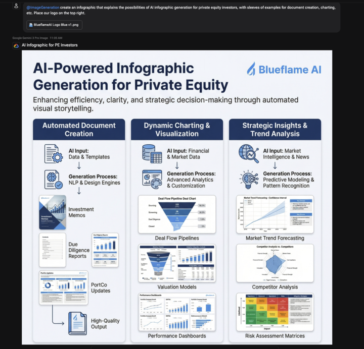 Stop spending hours manually building diagrams and charts. With Blueflame AI's image generation feature, you can turn complex data, research insights, and technical notes into polished, professional visuals in seconds—all while maintaining your firm's brand standards.