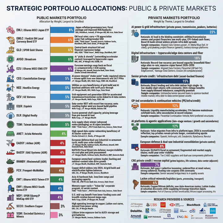 @ImageGeneration plot out the themes and portfolio recommendations above [context above pulled from research reports] into a two panel infographic, one side with a public portfolio recommendation with sorted weights by ticker and the other with key private investing themes